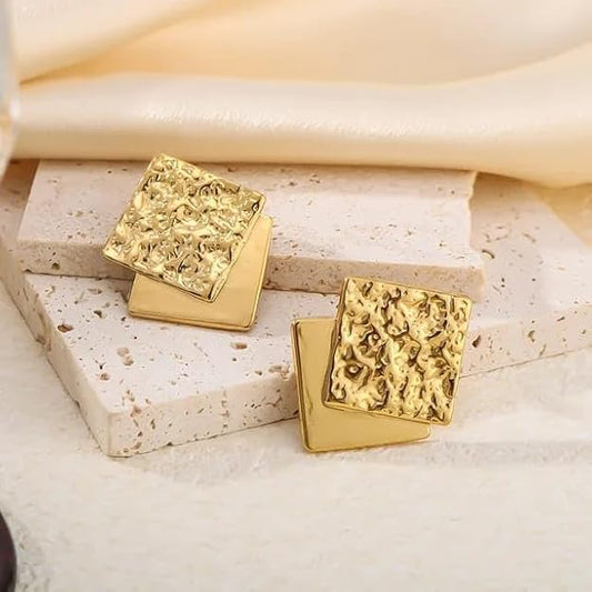 Aurelva Dual Texture Square Stud Earrings Brushed & Hammered Gold Plated